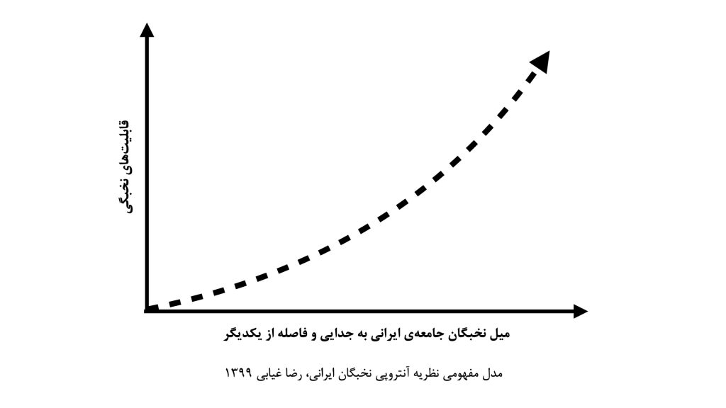 از طرفی، پراکندگی بسیار زیاد نخبگان ایرانی در آمار دبیرخانه شورای عالی امور ایرانیان خارج از کشور در قارههای گوناگون و همچنین تعداد کم محافلی همچون اندیشکدهها و اتاقهای فکر به نسبت مراکز صنعتی و آموزشی در داخل کشور نشان میدهد که نخبگان ایرانی چه در بین جمعیت مقیم ایران باشند و چه از آن چهار میلیون نفر ایرانی مقیم خارج از کشور، از هم جدا افتادهاند. تراژدی اینجاست که این جدایی فیزیکی و فکری، در چند دههی گذشته تبدیل به نوعی از هم گریزی هم شده است که نگارنده آن را «آنتروپی نخبگان» مینامد.